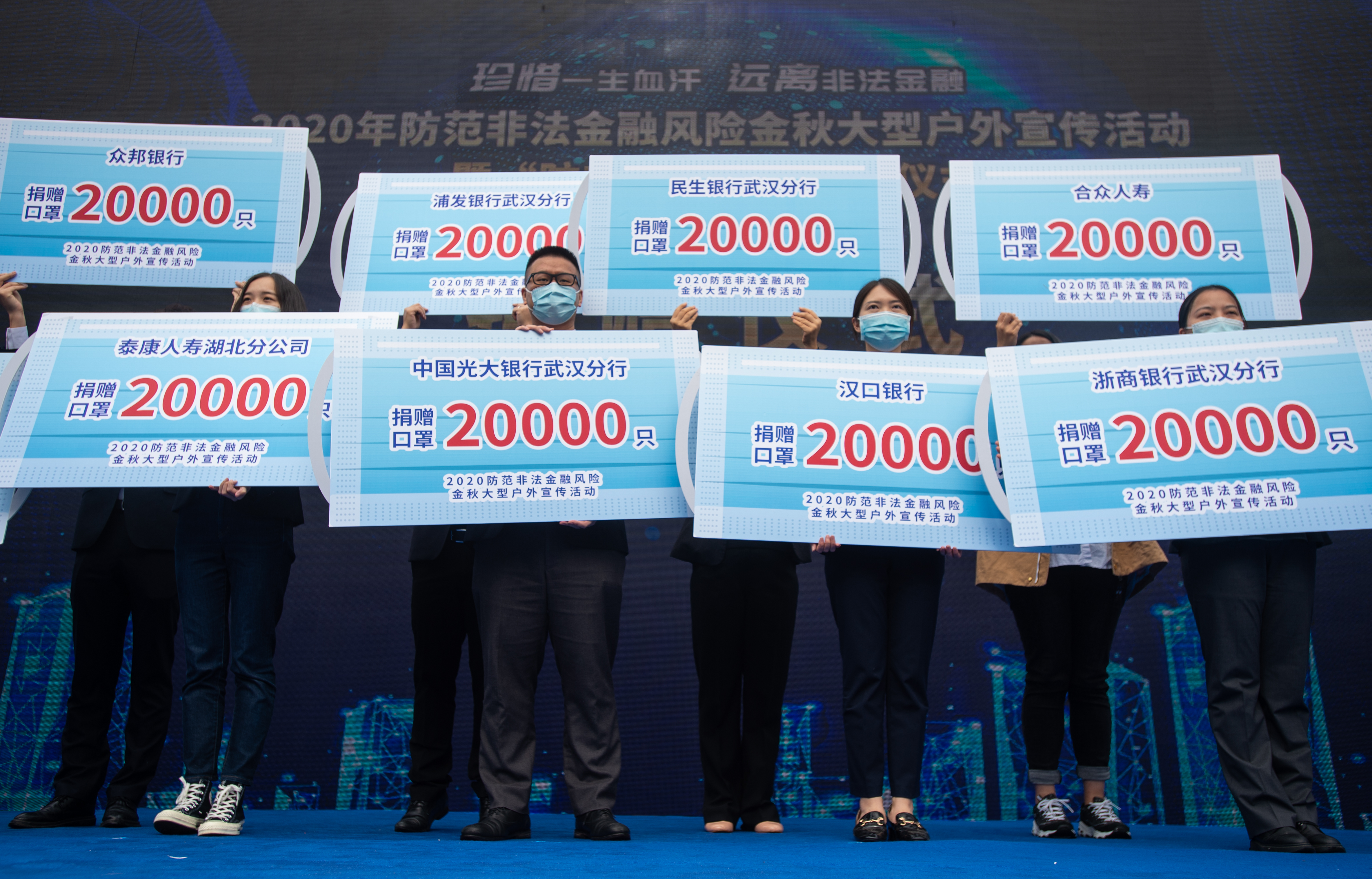 为进一步贯彻市委、市政府决策部署,坚决履行好防范化解重大风险政治任务,提升群众识别和防范非法金融活动能力,动员更多金融机构、社会团体、市民共同打好防范化解金融风险攻坚战,市防范化解金融风险攻坚战指挥部办公室于10月21日在武昌区积玉桥街武汉工人文化宫户外广场组织开展2020防范金融风险金秋大型户外宣传暨“防非轻骑兵”授牌活动。市人民政府副秘书长、市防范化解金融风险攻坚战指挥部办公室主任方洁,长江日报报业集团党委书记、董事长(社长)、总编辑陈光,市地方金融工作局、人行武汉分行营管部、武昌区政府分管领导,市公安局、检察院、法院、市场监管局等指挥部主要成员单位相关负责同志、积玉桥街道主要负责人,以及26家在汉主要银行、保险、证券金融机构代表出席。
