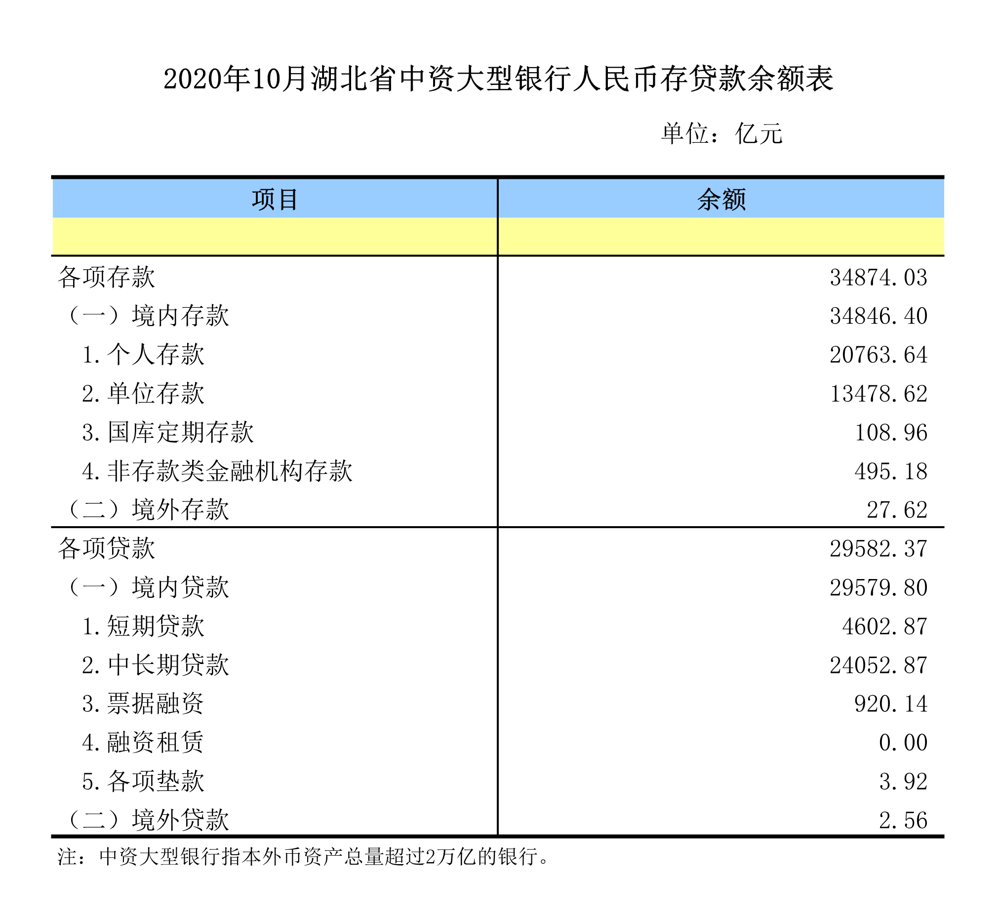 【统计数据】2020年10月湖北省中资大型银行人民币存贷款余额表
