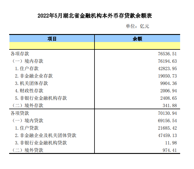 【统计数据】2022年5月湖北省金融机构人民币存贷款余额表
