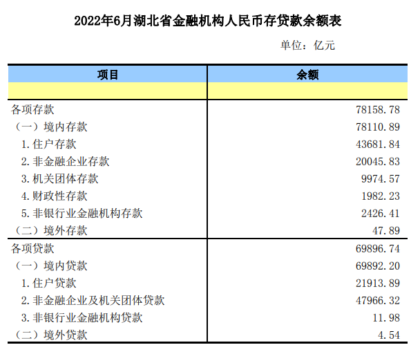 【统计数据】2022年6月湖北省金融机构人民币存贷款余额表