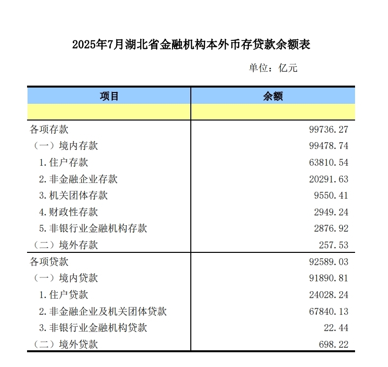 【统计数据】2025年7月湖北省金融机构本外币存贷款余额表