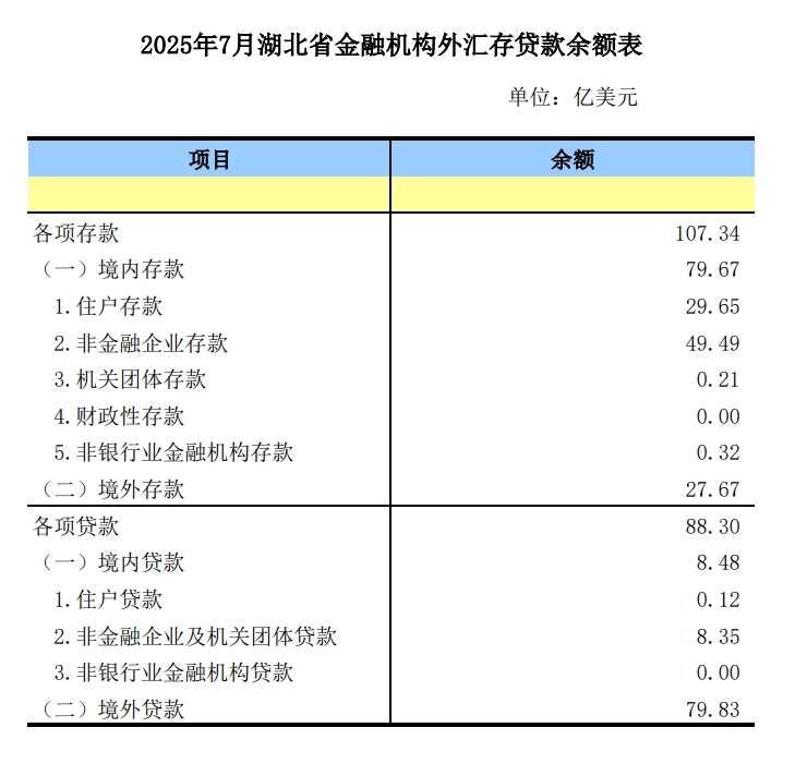 【统计数据】2025年7月湖北省金融机构外汇存贷款余额表