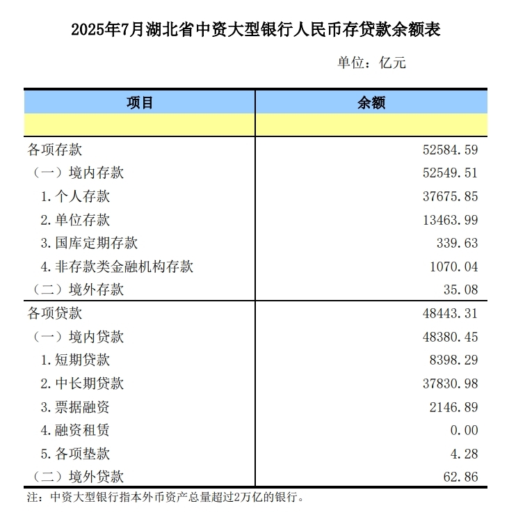 【统计数据】2025年7月湖北省中资大型银行人民币存贷款余额表