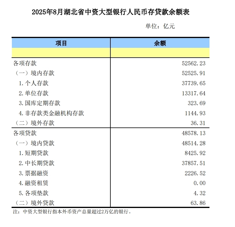【统计数据】2025年8月湖北省中资大型银行人民币存贷款余额表