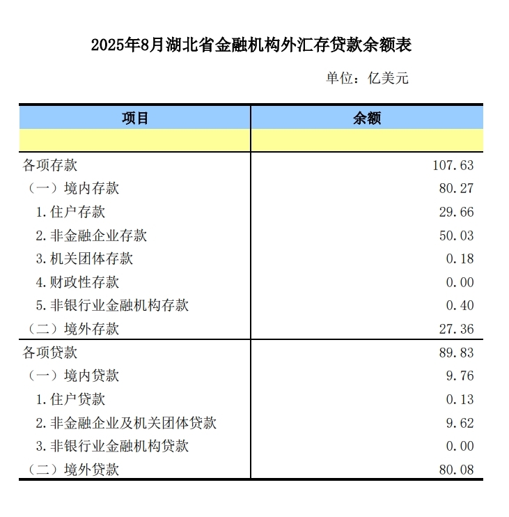 【统计数据】2025年8月湖北省金融机构外汇存贷款余额表