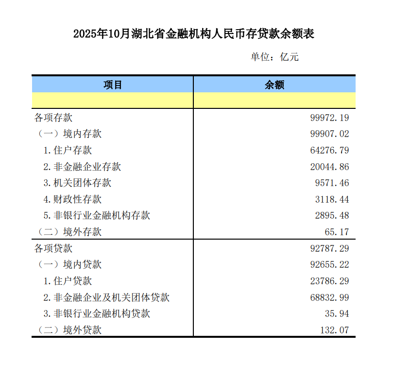 【统计数据】2025年10月湖北省金融机构人民币存贷款余额表