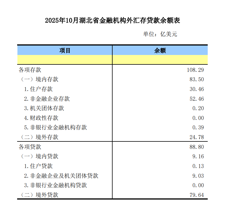 【统计数据】2025年10月湖北省金融机构外汇存贷款余额表