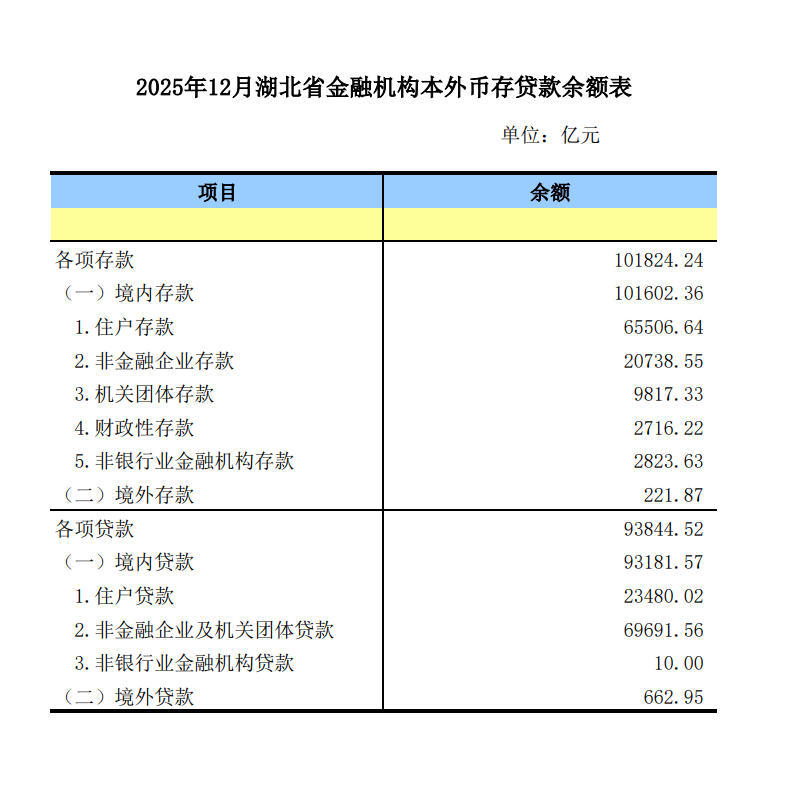 【统计数据】2025年12月湖北省金融机构本外币存贷款余额表