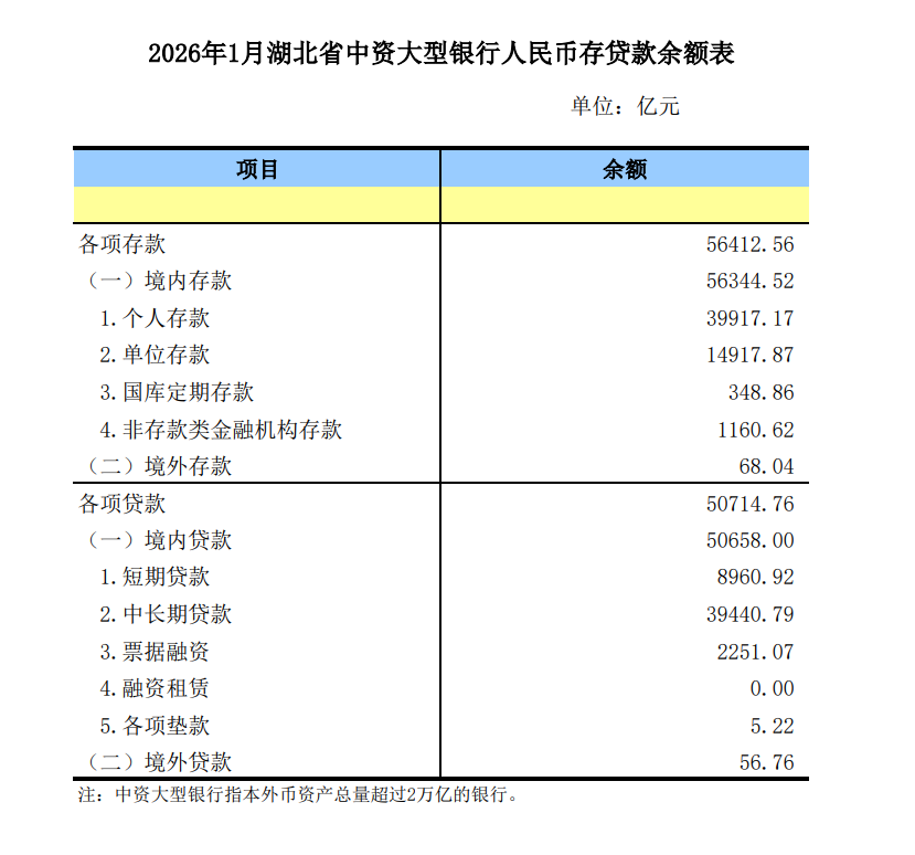 【统计数据】2026年1月湖北省中资大型银行人民币存贷款余额表