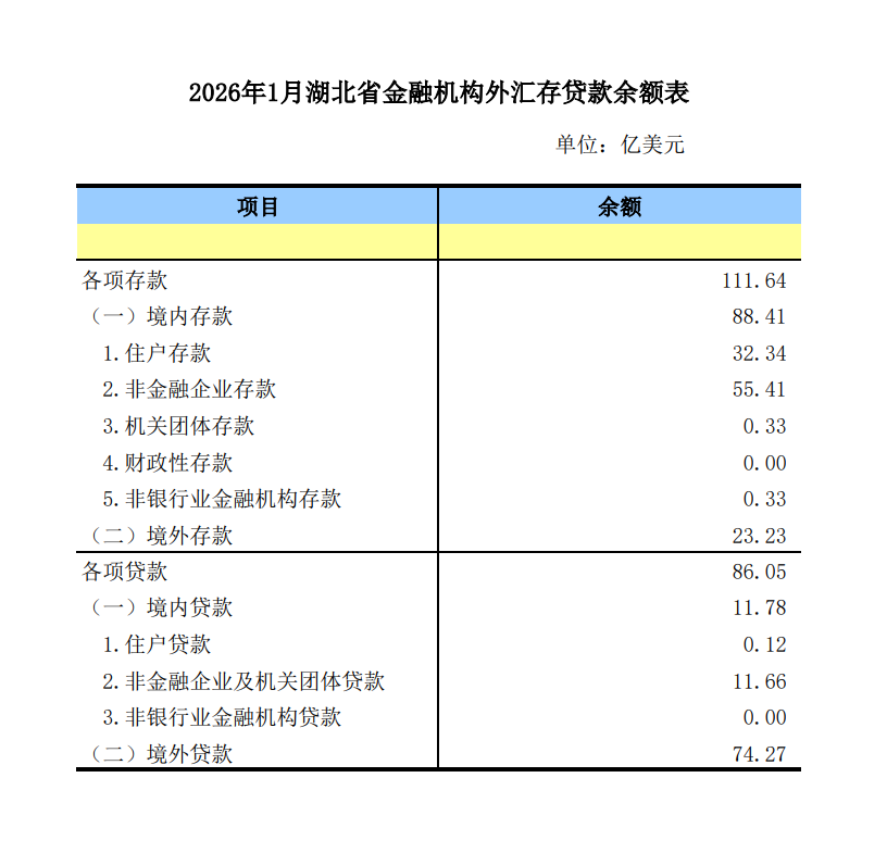 【统计数据】2026年1月湖北省金融机构外汇存贷款余额表