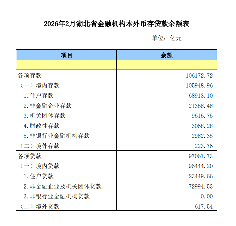 【统计数据】2026年2月湖北省金融机构本外币存贷款余额表
