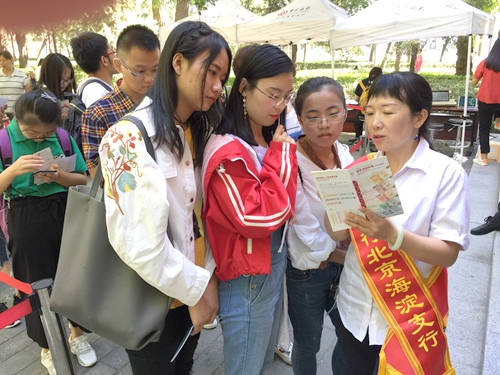 中行北京海淀支行近日于北京科技大学开展了以“反假货币,人人有责”为主题的反假货币宣传活动,将反假知识带进大学校园。图为该行工作人员为北京科技大学的新生们讲解有关人民币、美元、港币等货币的防伪要点。 杨畅 摄