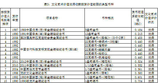 (三)由于市场的运行是复杂的,在文化艺术价值与收藏投资价值之间有时也会出现不统一和不协调的情况。在以上的评价结果中可以看到,在文化艺术价值优秀的币种中有36.55%的币种投资价值较弱,在文化艺术价值较弱的币种中有4.04%的币种投资价值相对较好。