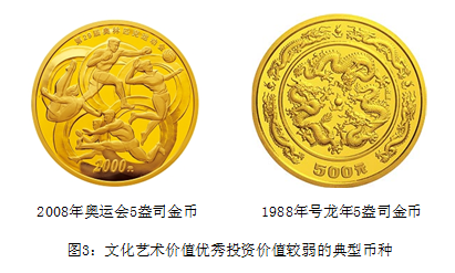 从市场实践的丰富案例和大量的数据中可以看到:一方面币种的文化艺术价值与收藏投资价值密切相关,从一般情况看币种文化艺术价值的优弱也会同步带动它们收藏投资价值的优弱。另一方面在币种文化艺术价值与收藏投资价值之间也会产生动态博弈,在某些情况下币种文化艺术价值的优弱也并不代表和体现它们投资价值的优弱。特别是在当前我国的金币市场中似乎存在一种价值重心偏移现象,既对收藏投资的注意力普遍高于对文化艺术价值的注意力,甚至出现仅仅把贵金属币当作与文化艺术价值无关的筹码进行投资投机运作的情况。正是由于我国金币市场的投资投机成分过重,造成了市场交易价格和收藏投资价值的大幅波动。
