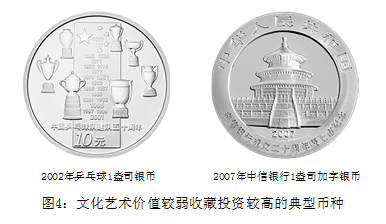 再例如2002年发行的“中国乒乓球建队50周年1盎司彩色银币”,项目的立意和设计都有很多争论,文化艺术价值评价不高,但是收藏投资价值相对具有一些优势,也形成了文化艺术价值与收藏投资价值相背离的状况。