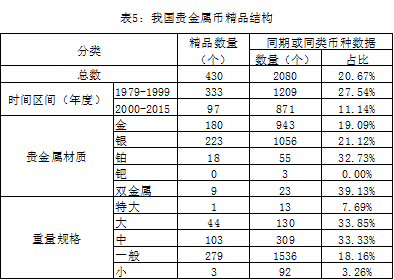 根据精品的基本概念和评价的具体标准,我国贵金属币的精品结构见表5,这些币种的名录见附表。