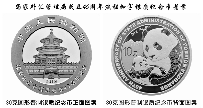 中国人民银行日前发布公告,定于2月25日发行国家外汇管理局成立40周年熊猫加字银质纪念币1枚。该银质纪念币为中华人民共和国法定货币。 该银质纪念币正面图案为北京天坛祈年殿,并刊国名、年号及“国家外汇管理局成立40周年纪念”中文字样。该银质纪念币背面图案为母子熊猫图,并刊“30g Ag .999”字样、“国家外汇管理局成立40周年纪念”英文字样及面额。