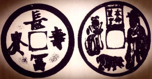 福德长寿背本命神星官亥猪图钱。直径56、厚3毫米,重41.9克。形体较大,圆形方孔,元代铸造。钱面“福德长寿”四字,楷书、旋读。钱背穿上框内“本命元神”四字,楷书。穿右为一星官图,头戴通天冠,双手执笏。穿左为小鬼托镜,镜内有本命生肖亥猪图,面向星官。(王纪洁)
