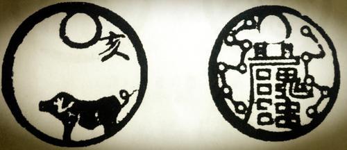 生肖亥猪背符箓星宿钱。直径25毫米、厚1.4毫米,重4.9克。圆形,上端有一孔为配饰之需,宋代铸。钱面右上方有一楷书“亥”字,正下方镌刻有一只猪图,头朝左,呈站立状,尾巴向上扬且卷曲,造型生动,惟妙惟肖。钱背正下方镌刻一道教符箓,右侧是南斗六星,左侧是北斗七星,分别主生死。
