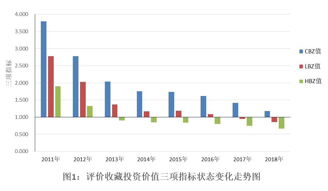 在3月16日发布的“中国金币市场2018年运行状况简报”中,有一组关于投资价值相对指标的数据(见图1)。这组数据表明,从整体上看我国现代贵金属币除CPI比较值(CBZ值)大于1之外,存款利率比较值(LBZ值)已经连续二年小于1,货币贬值速度比较值(HBZ值)已经连续六年小于1。也就是说随着大盘的持续下行,在上述时间区间内我国现代贵金属币的投资价值在整体上没有跑赢存款利率和货币贬值速度。