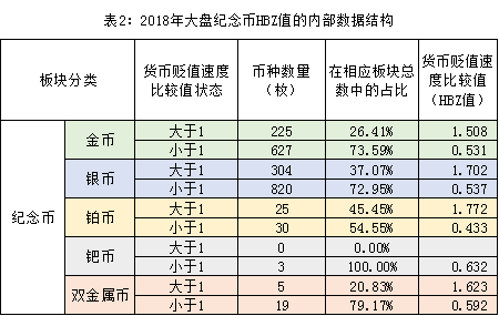 如表1所示:①在2018年大盘内部,货币贬值速度比较值大于1的币种609枚,小于1的币种1680枚,分别占比26.61%和73.39%。②在2018年大盘内部的投资金币中,货币贬值速度比较值大于1的币种36枚,小于1的币种158枚,分别占比18.56%和81.44%。③在2018年大盘内部的投资银币中,货币贬值速度比较值大于1的币种14枚,小于1的币种23枚,分别占比37.84%和62.16%。④在2018年大盘内部的纪念币中,货币贬值速度比较值大于1的币种559枚,小于1的币种1499枚,分别占比27.16%和72.84%。