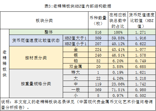 如表3所示:①老精稀板块整体性跑赢了货币贬值速度比较值。其中货币贬值速度比较值大于1的币种309枚,小于1的币种207枚,分别占比59.88%和40.12%。②按贵金属材质分类,金币和铂币整体上跑赢了货币贬值速度比较值。③按重量规格分类,特大、大和中等规格币种跑赢了货币贬值速度比较值。