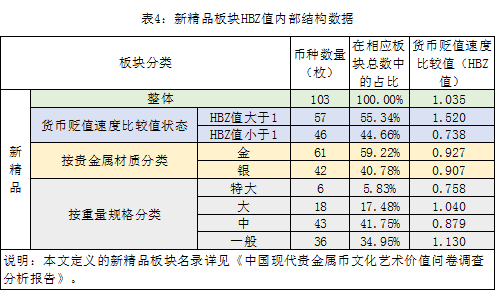 如表4所示:①新精品板块整体性跑赢了货币贬值速度比较值。其中货币贬值速度比较值大于1的币种57枚,小于1的币种46枚,分别占比55.34%和44.66%。②按重量规格分类,大规格和一般规格币种跑赢了货币贬值速度比较值。
