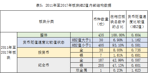 如表5所示:①2011年至2017年板块整体性没有跑赢货币贬值速度比较值。其中货币贬值速度比较值大于1的币种30枚,小于1的币种405枚,分别占比6.90%和93.10%。②在各种细分板块中,只有“中国熊猫金币发行35周年金银纪念币”项目中的“30克金+12克银”双金属币跑赢货币贬值速度比较值。