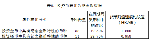 如表6所示:①在投资金币中有38枚币种已经具有纪念币特征,占同期同类币种总数的19.59%,货币贬值速度比较值整体录得1.600。②在投资银币中有11枚币种已经具有纪念币特征,占同期同类币种总数的29.73%,货币贬值速度比较值以非常接近1。