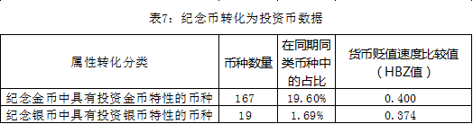 如表7所示:①在纪念金币中有167枚币种已经具有投资币特征,占同期同类币种总数的19.60%,货币贬值速度比较值整体录得0.400。②在纪念银币中有19枚币种已经具有投资银币特征,占同期同类币种总数的1.69%,货币贬值速度比较值整体录得0.374。