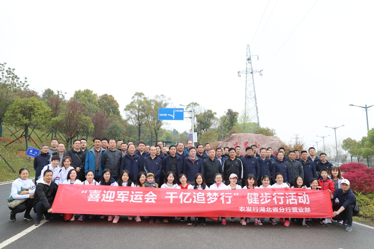 农发行湖北省分行营业部员工在龙灵山生态公园开展“喜迎军运会 千亿追梦行”健步行活动。(万盈、赵浛羽摄)