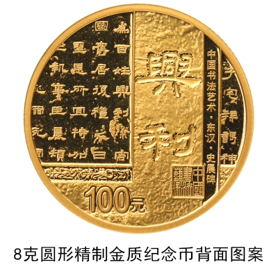 8克圆形金质纪念币背面图案为东汉史晨碑局部文字及其“兴利”字样与汉代画像砖纹饰、“中国书法艺术”篆刻钤印等组合设计,并刊“中国书法艺术·东汉·史晨碑”字样及面额。
