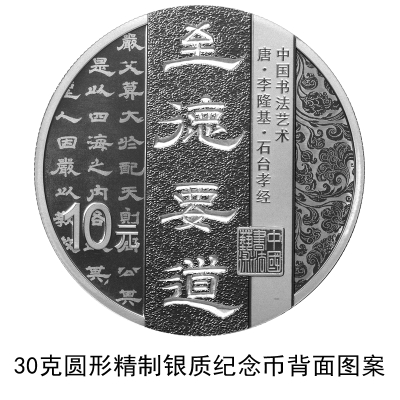 30克圆形银质纪念币背面图案为唐代李隆基石台孝经局部文字及“至德要道”字样与唐代石刻缠枝花纹、“中国书法艺术”篆刻钤印等组合设计,并刊“中国书法艺术·唐·李隆基·石台孝经”字样及面额。