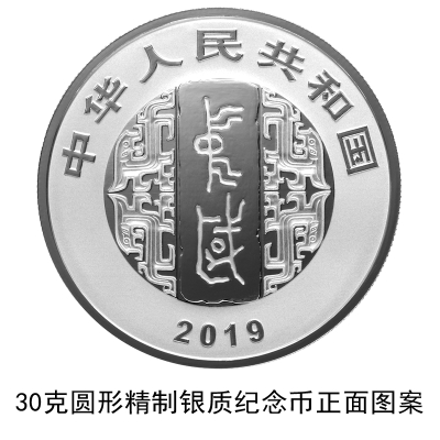 30克圆形银质纪念币背面图案为战国末至秦睡虎地秦简局部文字及“惠以聚之”字样与“中国书法艺术”篆刻钤印等组合设计,并刊“中国书法艺术·战国末至秦·睡虎地秦简”字样及面额。