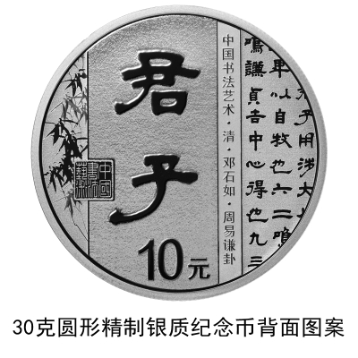 30克圆形银质纪念币背面图案为清代邓石如书周易谦卦局部文字及“君子”字样与清代竹图案、“中国书法艺术”篆刻钤印等组合设计,并刊“中国书法艺术·清·邓石如·周易谦卦”字样及面额。
