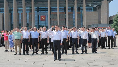 6月28日上午,人民银行杭州中心支行党委率领“不忘初心、牢记使命”主题教育集中研学暨党委理论学习中心组(扩大)读书班的同志前往嘉兴南湖,重温“红船精神”,开展“红船精神”现场教育。图为党委书记、行长殷兴山率领全体同志在南湖革命纪念馆前重温入党誓词。(沈杭 叶永骏)