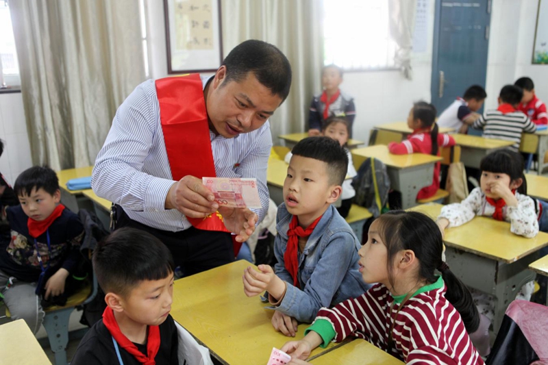 普及金融知识要从娃娃抓起。为帮助少年儿童树立金融安全意识,提升自我保护能力,浙江省三门农商银行日前在社区、企业、学校开展“送金融知识进课堂”活动。图为来自该行的青年员工志愿者在为三门县外国语小学二年级学生讲授人民币防伪知识。(燕平 通讯员 任凭)