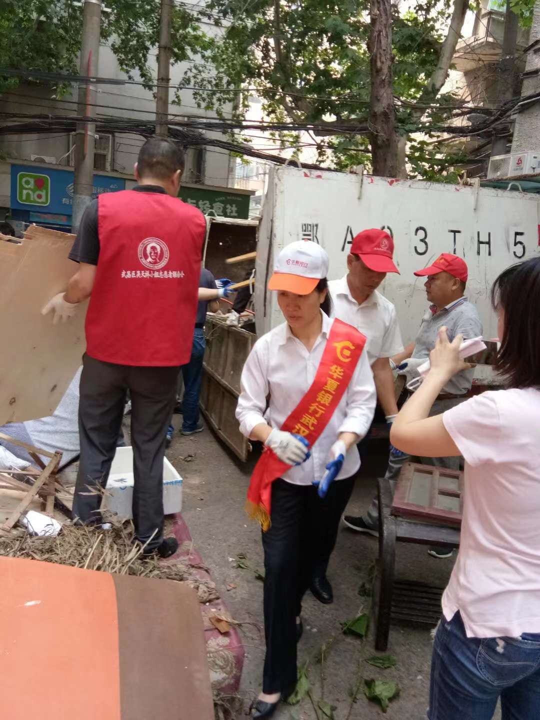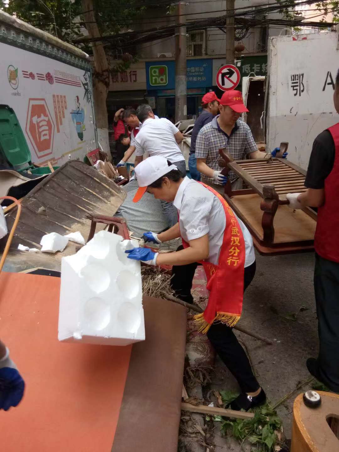近日,华夏银行武汉分行组织党员志愿者队走进中南路街小刘家湾社区开展“迎接军运会,清洁家园”活动。