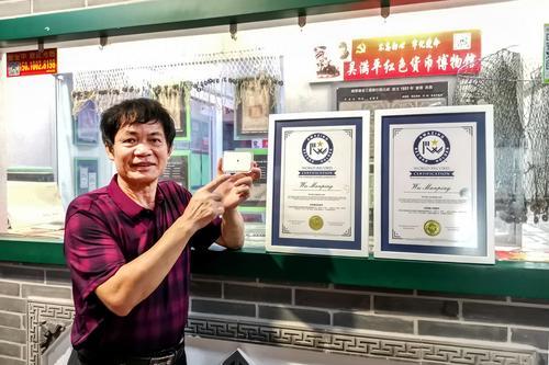 吴满平与他收藏的“豆半两”和两张世界纪录认证证书。