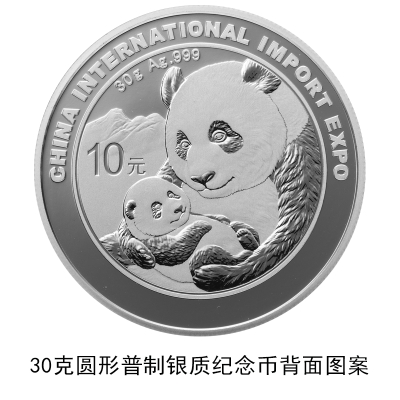 30克圆形银质纪念币背面图案为母子熊猫图,并刊“30g Ag.999”字样、“中国国际进口博览会”英文字样及面额。