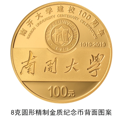 8克圆形金质纪念币背面图案为南开大学校名及校徽等组合设计,并刊“南开大学建校100周年”中文字样、“NANKAI UNIVERSITY CENTENARY CELEBRATION”英文字样、“1919-2019”及面额。