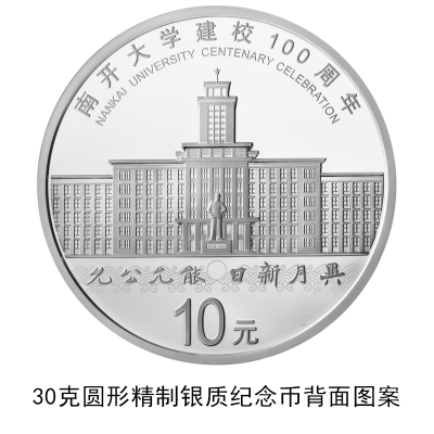 30克圆形银质纪念币背面图案为南开大学主楼、校训及校钟装饰纹样等组合设计,并刊“南开大学建校100周年”中文字样、“NANKAI UNIVERSITY CENTENARY CELEBRATION”英文字样及面额。