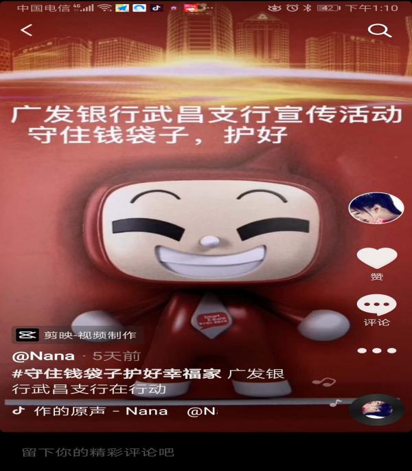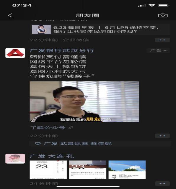 除了常态化网点宣传、户外宣传外,结合地区疫情形势及防控要求,广发银行武汉分行积极探索发挥新媒体渠道的宣传辐射作用,一是在广发银行武汉分行微信公众号上发布了防范电信网络诈骗、防范非法集资等知识;二是制作防范非法集资小视频通过广发银行武汉分行微信官方朋友圈进行推广;三是辖内分支机构自制防范非法集资抖音小视频,积极进行转发宣传。新媒体渠道宣传突破了传统媒介的限制,扩大了宣传覆盖面,提升了人民群众参与打击非法集资活动的积极性。