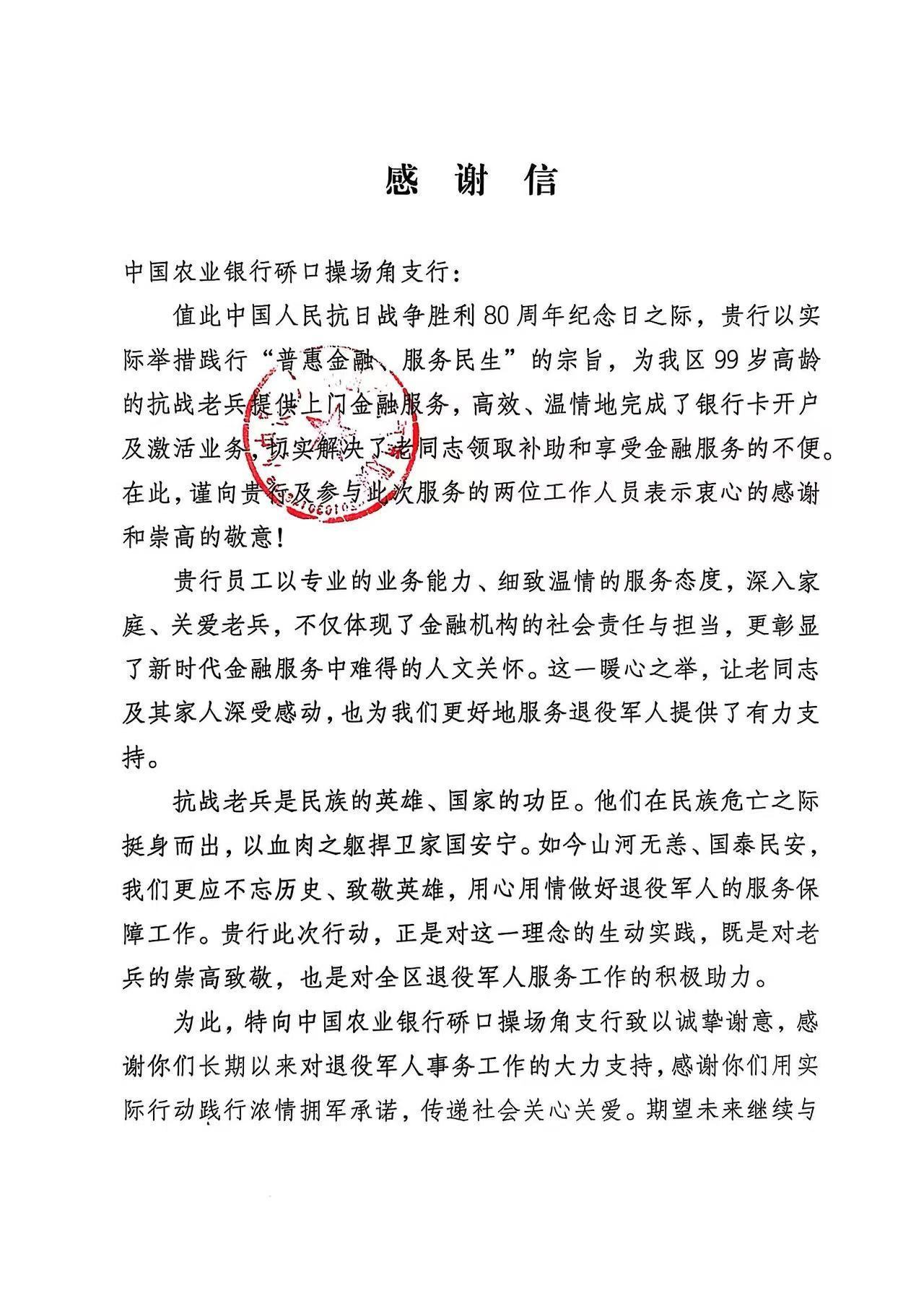 在纪念中国人民抗日战争胜利的特殊日子里,农行武汉分行操场角支行聚焦老年客户需求,专程为99岁高龄的抗日退伍老兵提供上门金融服务,用实际行动践行普惠金融理念,向英雄致以崇高敬意。