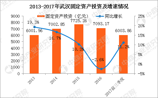 为招商引资,为武汉经济发展为基础,武汉近几年疯狂做基建,固定资产投资持续增长。2013年武汉固定资产6001.96亿元,2016年增至7093.17亿元,四年复合增长5.7%。2017年前三季度,武汉固定资产投资6003.86亿元,超2013年全年水平,比上年同期增长11.2%,目前已经完成2016年全年的84.6%。据悉,2017年前三季度武汉基础设施投资1549.23亿元,增长16.3%;工业投资1838.09亿元,比上年同期增长12%,为2015年以来30个月最高增速。前三季度武汉市房地产开发投资2130.05亿元,增长8.6%。