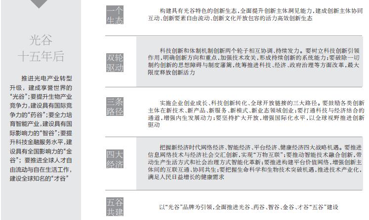通过实施企业创业成长、科技创新转化、全球开放链接的“三条路径”,把握新经济时代网络经济、智能经济、平台经济、健康经济“四大经济”战略机遇,最终实现以“光谷”品牌为引领,全面推进光谷、药谷、智谷、金谷、才谷“五谷共建”。