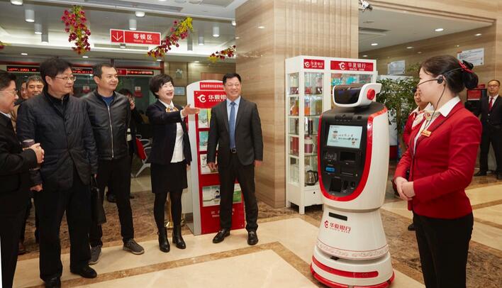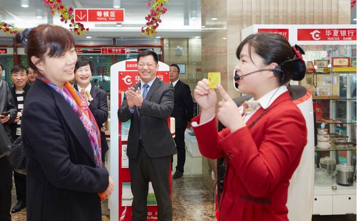 代表一行集体参观了华夏银行武汉分行营业部,观摩了华夏银行自助研发的智能发卡机器人“华小夏”的现代服务,“华小夏”除具备业内机器人通用的卖萌聊天的功能外,还具备厅堂迎宾、分流引导、业务咨询、业务办理等四大特色功能。一名代表现场体验了智能发卡的全过程,新颖、便捷、高效的服务获众代表点赞。