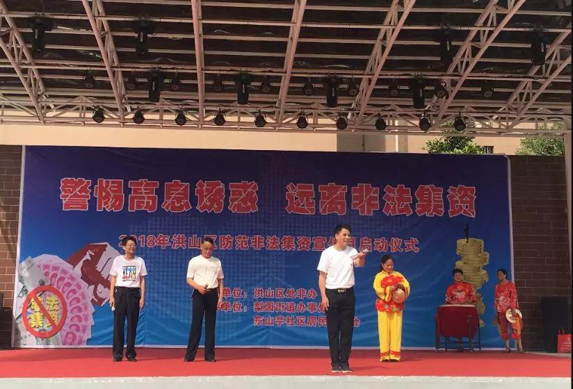 为进一步加强金融知识普及宣传,提高居民群众防范非法集资意识,6月7日下午3点,洪山区处非办在梨园街东亭社区举办“远离高息诱惑 警惕非法集资”——2018年洪山区防范非法集资宣传月启动仪式。