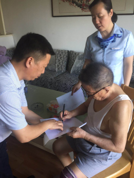 事情缘于一本消磁的活期存折,几天前,中国建设银行武汉黄陂支行客户张先生神色匆匆来到网点,告知该支行其父亲的养老金将一直于在我行开立的活期存折中发放,但其父亲因腿疾行动不便,无法亲自到银行办理消磁换折业务。黄陂支行营业部获知情况后,在坚守合规的前提下,为了能让老人正常使用领取养老金,支行决定为老人提供上门服务。次日,黄陂支行营业部两位员工冒着酷暑前往客户张先生家中开展上门核实工作,在确认老人家实际情况和意愿后,详细告知其业务办理流程,耐心指导老人填写业务办理授权书,并顺利完成了存折消磁换折代办业务。