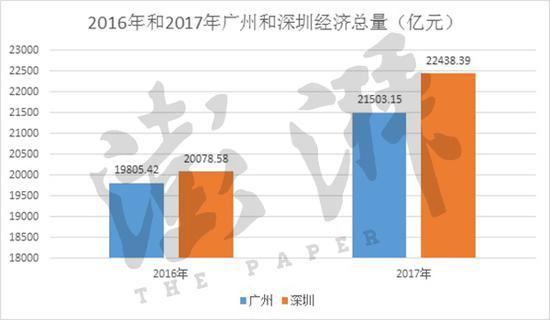 2017年,深圳经济总量为22438.39亿元(含R&D支出纳入GDP部分,含深汕特别合作区),广州为21503.15亿元。两市总量差距拉大,深圳超广州935.24亿元。